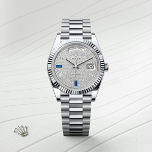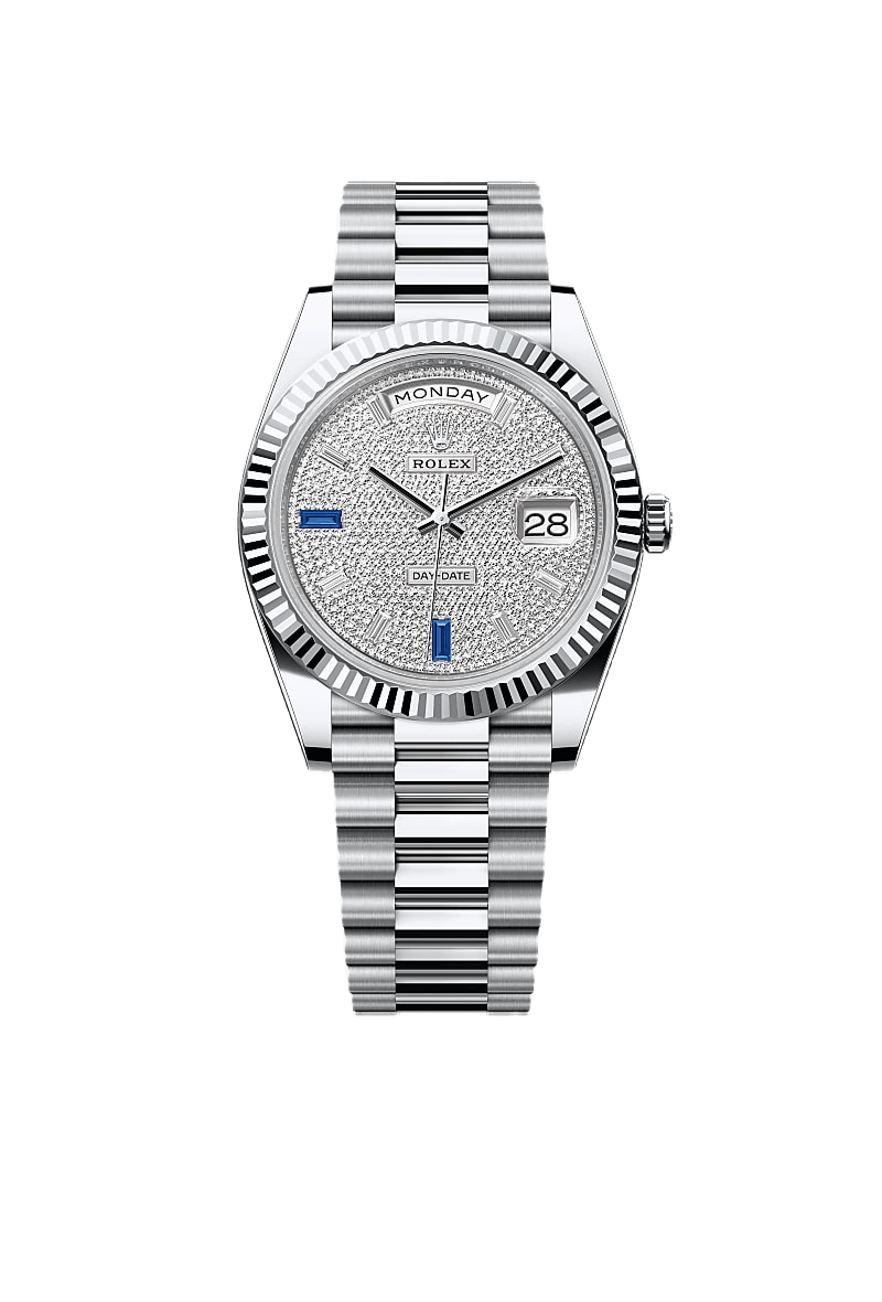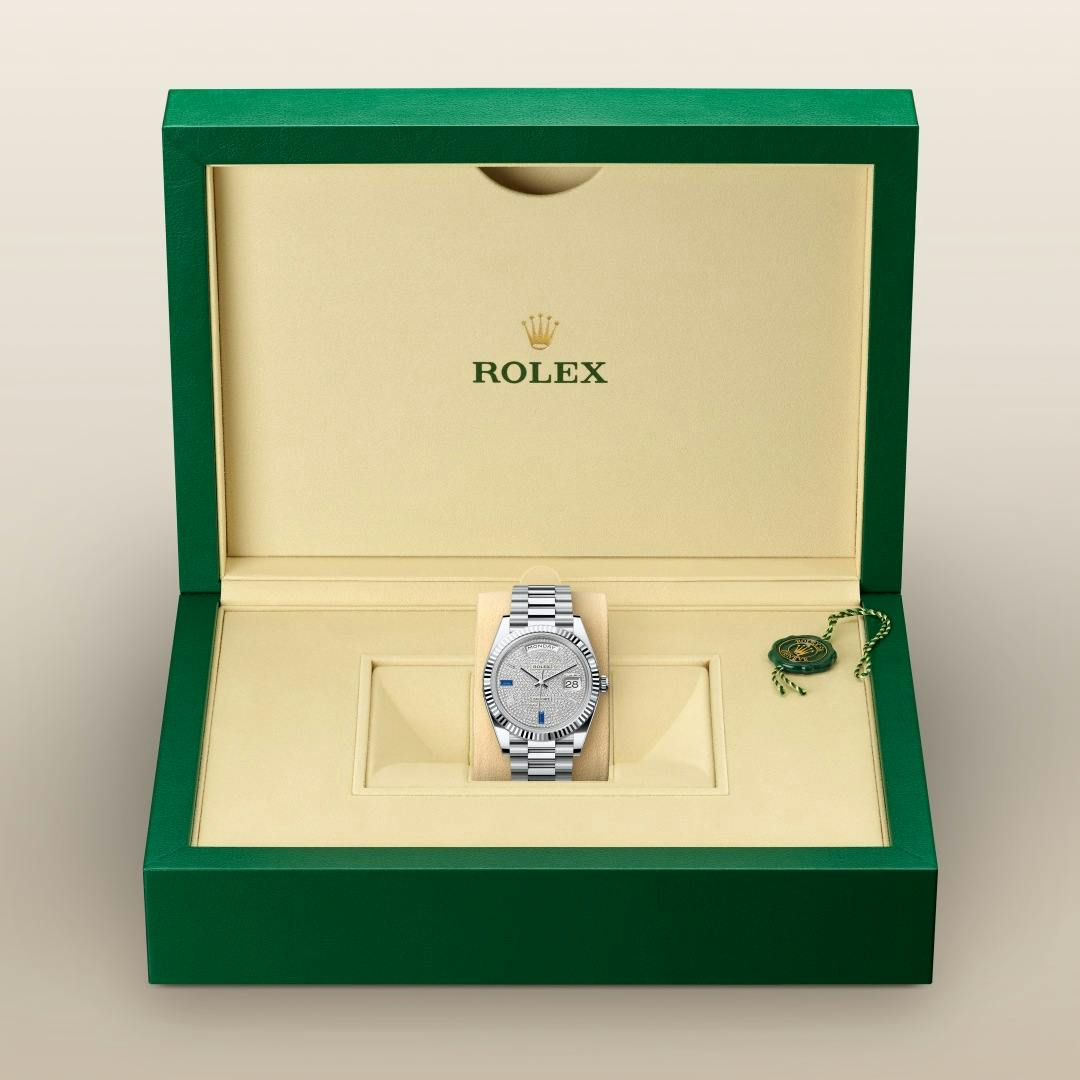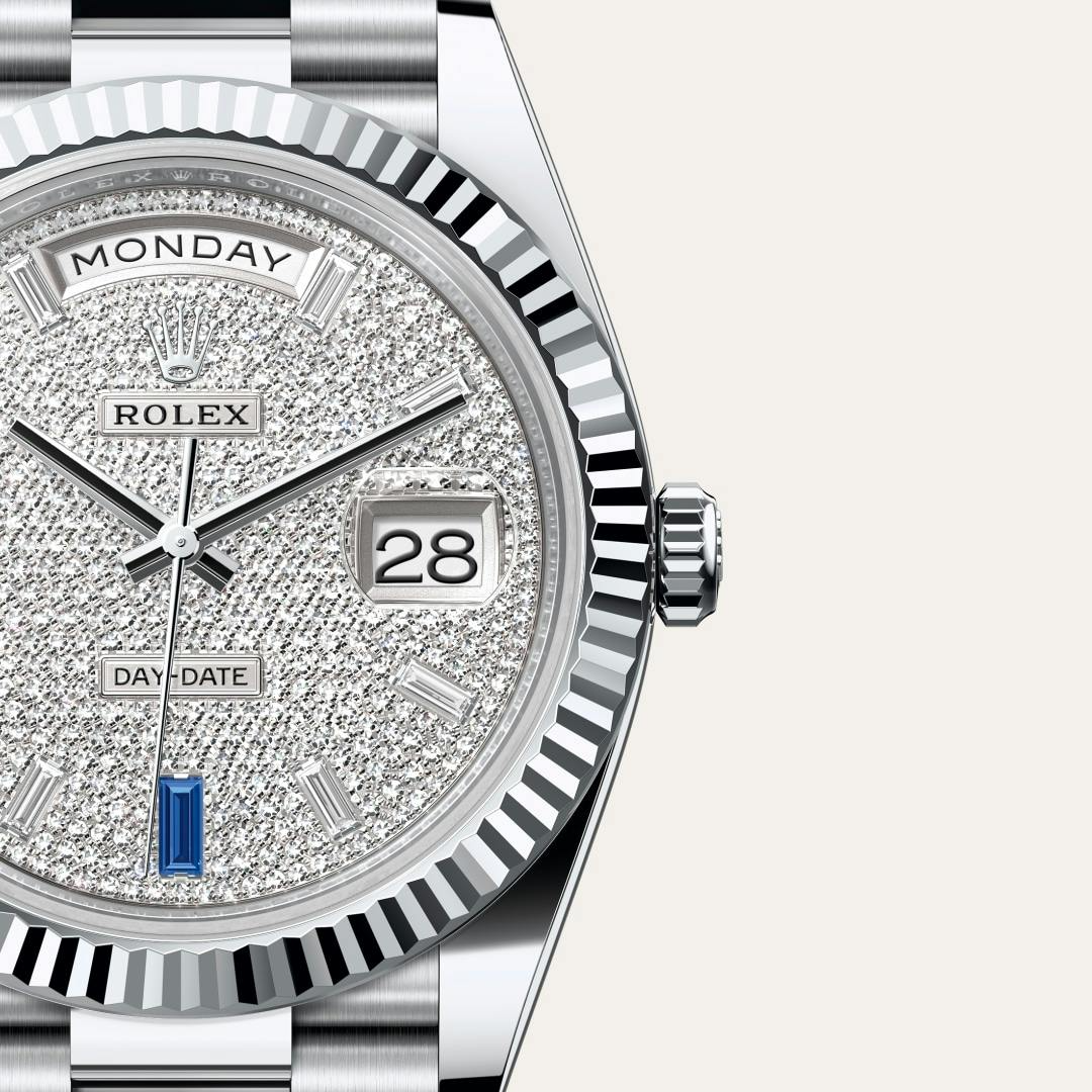 The Rolex fluted bezel is a mark of distinction. Originally, the fluting of the Oyster bezel had a functional purpose: it served to screw the bezel onto the case helping to ensure the waterproofness of the watch. It was therefore identical to the fluting on the case back, which was also screwed onto the case for waterproofness, using specific Rolex tools. Over time, the fluting became an aesthetic element, a genuine Rolex signature feature. Today the fluted bezel is a mark of distinction, in platinum on this Day-Date 40.
